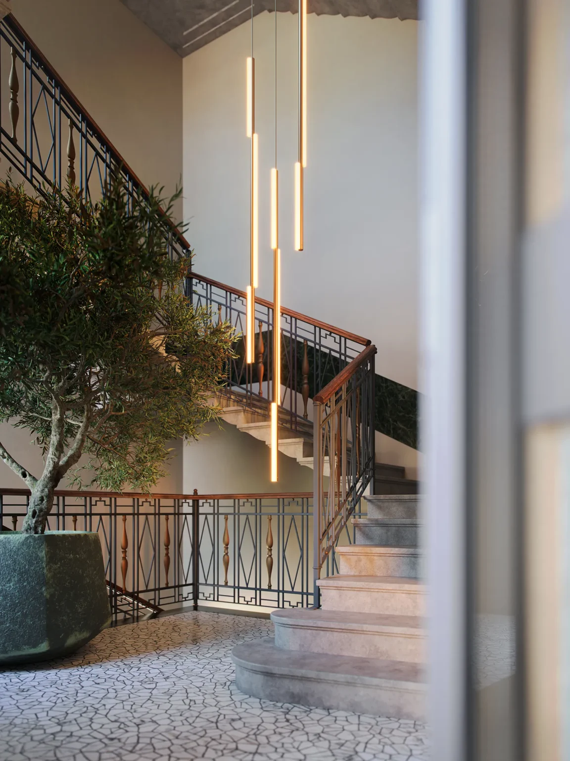 Mentre la townhouse si staglia maestosa su un lato, il corpo principale si sviluppa a partire dalla scalinata finemente riportata allo splendore originale.